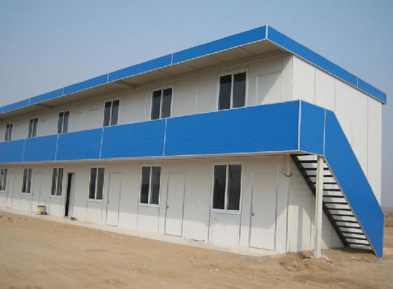 鸿浩双层彩钢活动房为单坡排水,通过立柱、横梁、抗风柱及其彩钢夹芯板的自身强度组成的房屋系统。屋面三周附加封檐板作保护,从而达到安全美观的使用要求,具体用料及性能如下: